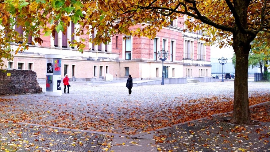 Goldene Herbstsonnenstrahlen scheinen durch die Kronen der Eichen und Ahornbäume am Martin-Gropius-Bau, aus denen mit steter Regelmäßigkeit einzelne gelbe Blätter herabfallen und wie in Zeitlupe aufs Kopfsteinpflaster segeln.
